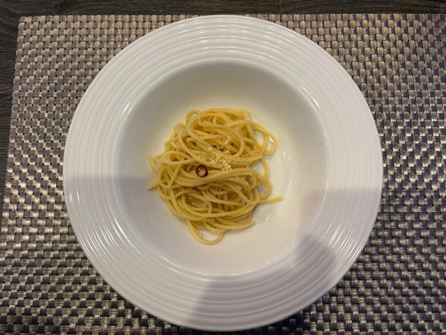 食べた順番に、サラダとカニのパイ、何だか忘れた魚のソテー、ポークと野菜、ペペロンチーノ、ティラミス。